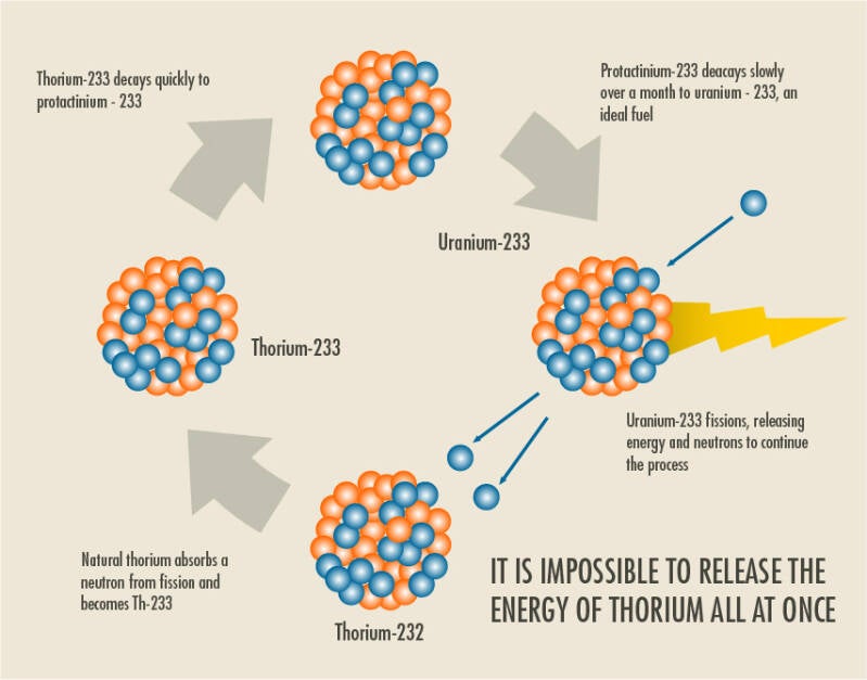 In a future liquid-fluoride thorium reactor, the fuel cycle would be quite different. The reactor would ideally be started by a modest inventory of uranium-233. Fission of U-233 in the reactor generates thermal power as well as excess neutrons that would be captured in a blanket fluid containing thorium tetrafluoride in solution. Thorium, having absorbed a neutron, first decays to protactinium and ultimately to uranium-233. New fuel would be chemically removed from the blanket fluid either at the uranium stage or the protactinium stage, which has additional complexity and advantages. The new uranium fuel would be introduced into the fuel salt of the LFTR at the same rate at which it is consumed.