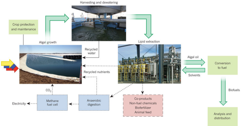 he algae must be harvest and break down the cell walls with chemical solvents, then extract the inner lipids, proteins and carbs, which undergo a final processing step to convert them into biofuel. Then there is the need to scale up the entire process, growing the microalgae at an industrial scale in vast outdoor pools requiring huge amounts of land and tremendous quantities of fresh or salt water.